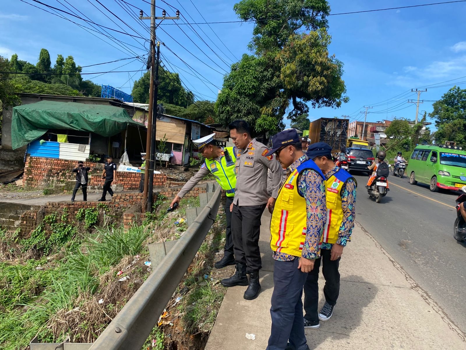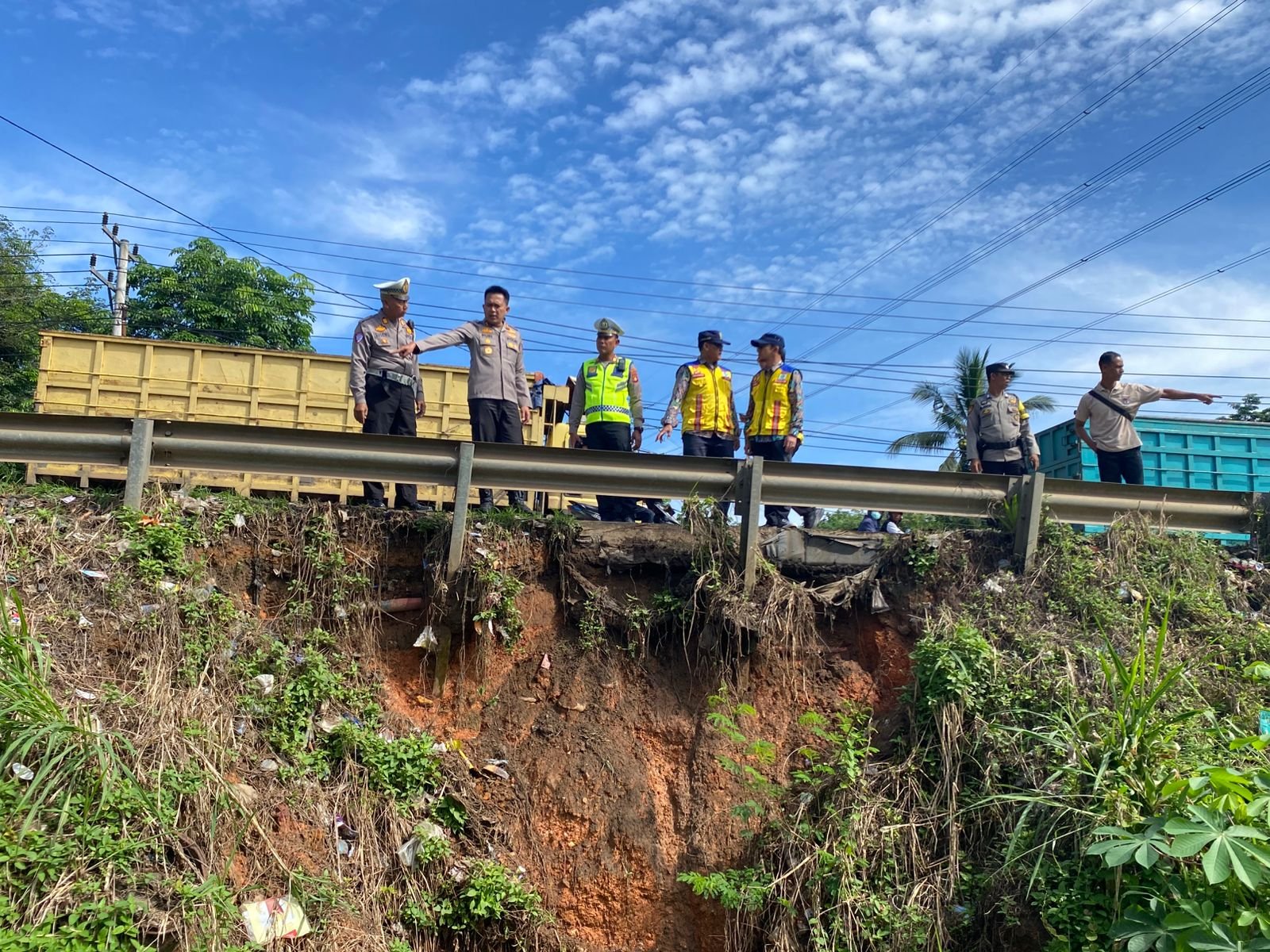 Dalam peninjauan tersebut, Kapolres dan jajaran melihat langsung kondisi kontur tanah, titik penurunan bahu jalan, serta potensi pergerakan tanah akibat intensitas hujan yang meningkat.