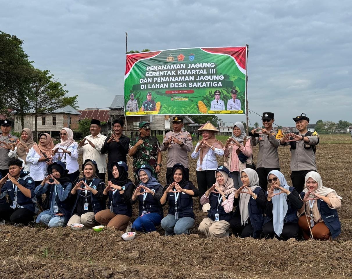 Kolaborasi untuk Ketahanan Pangan — Mahasiswa, aparat kepolisian, TNI, dan masyarakat Desa Sakatiga berfoto bersama usai kegiatan ‘Penanaman Jagung Serentak Kuartal III’ di lahan pertanian desa, Selasa (9/7/2025). Kegiatan ini merupakan bagian dari program ketahanan pangan yang melibatkan berbagai pihak guna mendukung swasembada jagung di wilayah tersebut