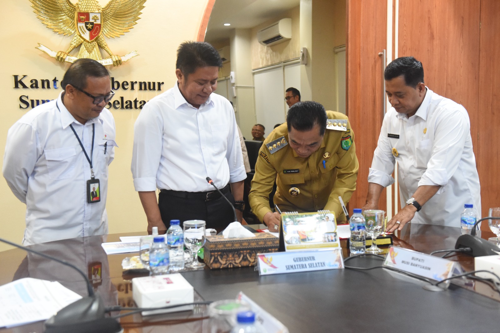 BERITA SRIWIJAYA,PALEMBANG | Gubernur Sumatera Selatan (Sumsel) H Herman Deru bersama Bupati Kabupaten Musi Banyuasin H. M. Toha dan Bupati Banyuasin H. Askolani menandatangani berita acara kesepakatan bersama terkait persentase pembagian porsi saham participating interest 10 persen pengelolaan minyak dan gas bumi Wilayah Kerja Rimau, bertempat di ruang tamu Gubernur Sumsel, Senin (5/5/2025).