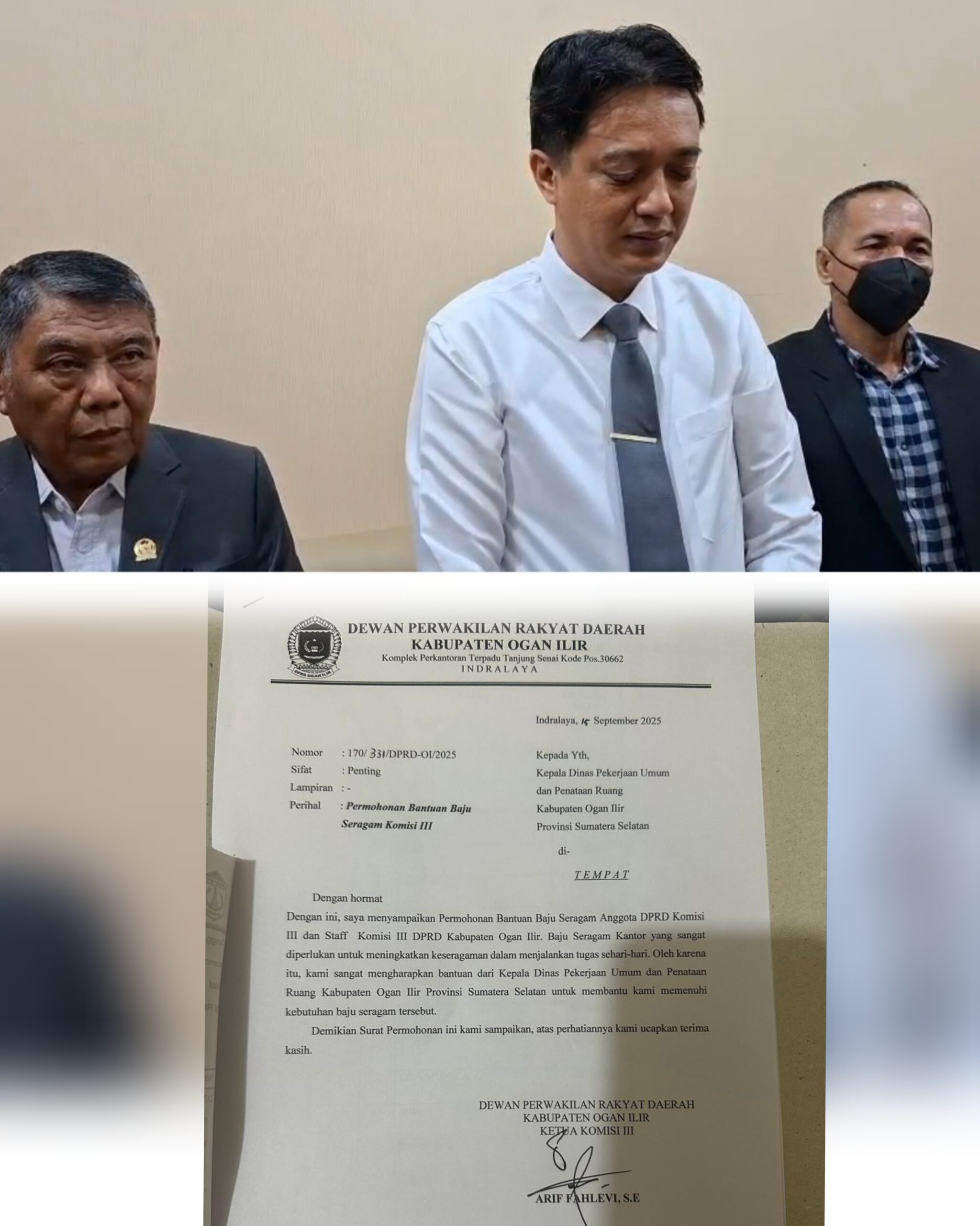 OGAN ILIR, Beritasriwijaya.com – DPRD Kabupaten Ogan Ilir tengah menjadi buah bibir setelah beredarnya surat resmi berkop DPRD yang ditujukan kepada salah satu Organisasi Perangkat Daerah (OPD). Surat bernomor 170/331/DPRD-01/2025 itu berisi permohonan bantuan pengadaan seragam untuk anggota dan staf salah satu komisi.