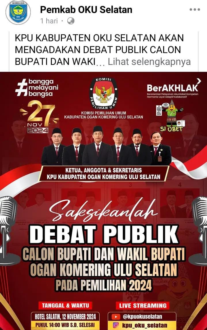 Palembang-Debat kandidat Pilkada OKU Selatan yang berlangsung di Hotel Salatin, Palembang, pada Selasa, 12 November 2024, mempertemukan empat pasangan calon (paslon) Bupati dan Wakil Bupati OKU Selatan.