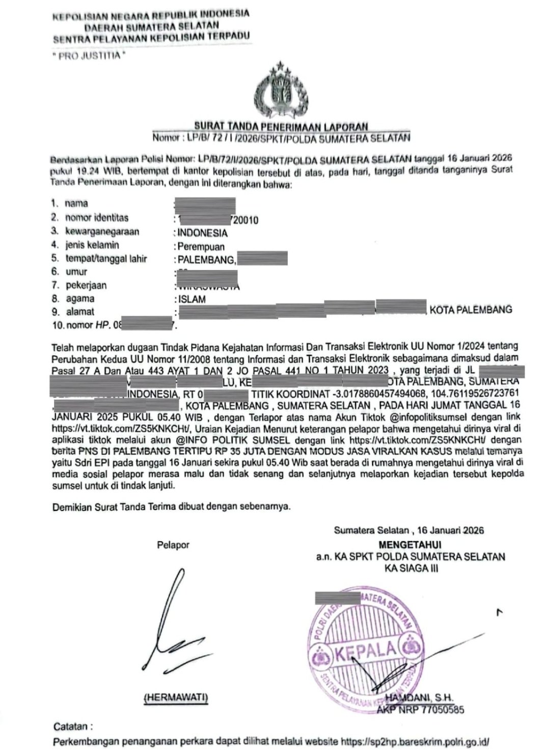 Atas dasar itu, pihaknya menempuh jalur hukum dengan melaporkan unggahan tersebut ke Polda Sumatera Selatan. Laporan tersebut telah diterima secara resmi dan tercatat dengan Nomor: LP/B/72/I/2026/SPKT/Polda Sumatera Selatan.