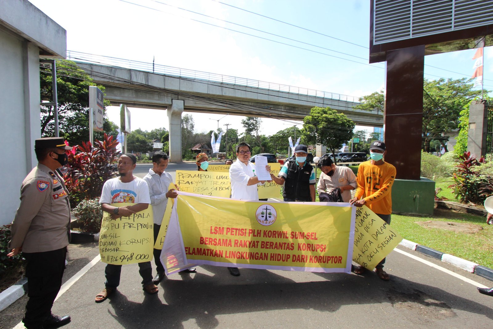 Palembang, Beritasriwijaya.com — Puluhan massa yang tergabung dalam Lembaga Swadaya Masyarakat (LSM) Pemuda Anti Korupsi – Peduli Lingkungan Hidup (PETISI – PLH) menggelar aksi unjuk rasa di Kejaksaan Tinggi Sumatera Selatan (Kejati Sumsel), Rabu (22/06/2022). Aksi tersebut dilakukan untuk menuntut penuntasan dugaan korupsi dana Bantuan Langsung Tunai (BLT) yang diterima oleh warga di Kabupaten Ogan Komering Ulu (OKU) Selatan. Massa aksi memprotes dugaan pemotongan dana BLT yang dilakukan oleh oknum kepala desa (Kades) sebesar Rp. 900.000,- yang dipotong menjadi Rp. 450.000,- per Keluarga Penerima Manfaat (KPM) di beberapa desa di Kabupaten OKU Selatan.