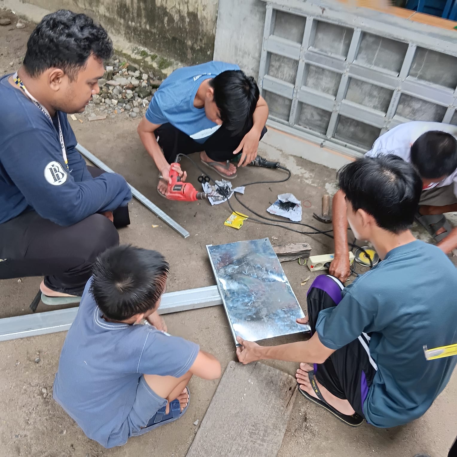 Menariknya, seluruh proses pembuatan plang dilakukan secara manual oleh para mahasiswa. Dimulai dari memotong bahan seng, mengebor, merakit rangka, hingga menuliskan nama jalan, semua dikerjakan secara bersama-sama di depan posko KKN yang disulap menjadi bengkel kerja sederhana.