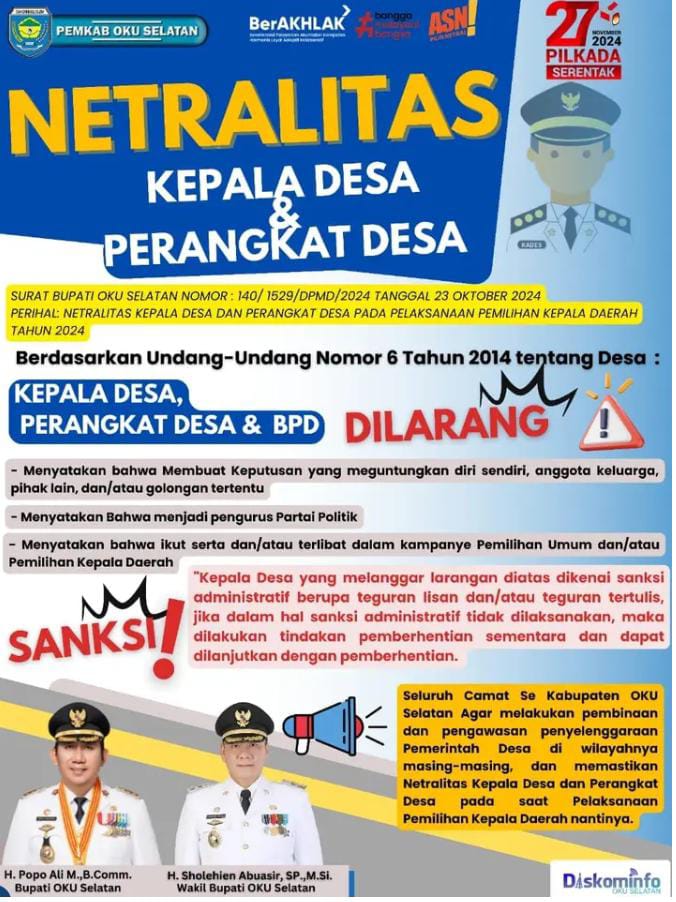 Seluruh Camat Se Kabupaten OKU Selatan Agar Melakukan Pembinaan dan Pengawasan Penyelenggaraan Pemerintah Desa di Wilayahnya Masing-masing dan Memastikan Netralitas Kepala Desa dan Perangkat Desa Pada Saat Pelaksanaan Pemilihan Kepala Daerah Nantinya.