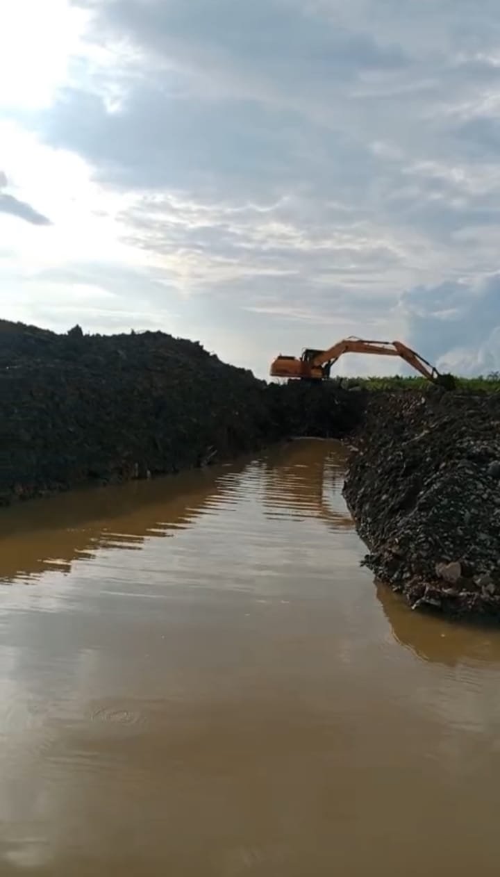 Saat ini, proses pelebaran aliran dan penataan lahan masih berlangsung. Alat berat terlihat beroperasi untuk menggali dan memperluas jalur air di sisi lahan yang dulunya merupakan area rawa.